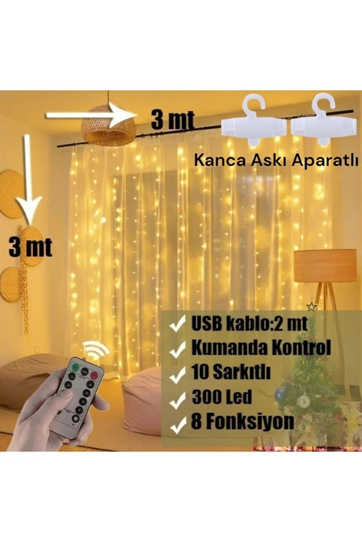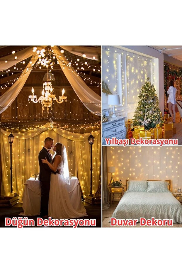 300 Ledli 10 Sarkıt Perde Led Işık-8 Fonksiyon, Uzaktan Kumandalı, 3x3 Metre